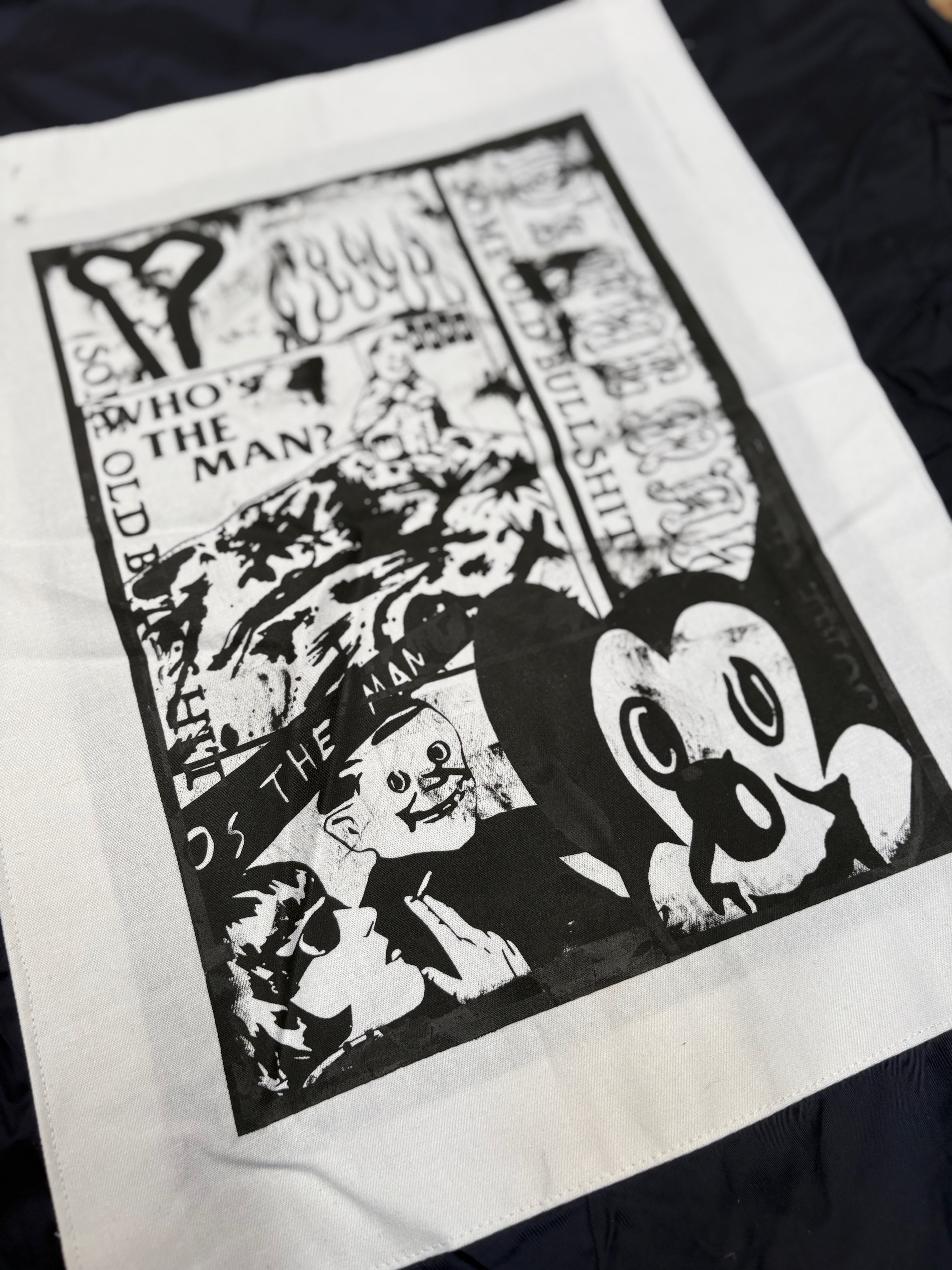 バックはホワイトのツイル地にブラックインクでプリントしたパッチを縫い付けています。